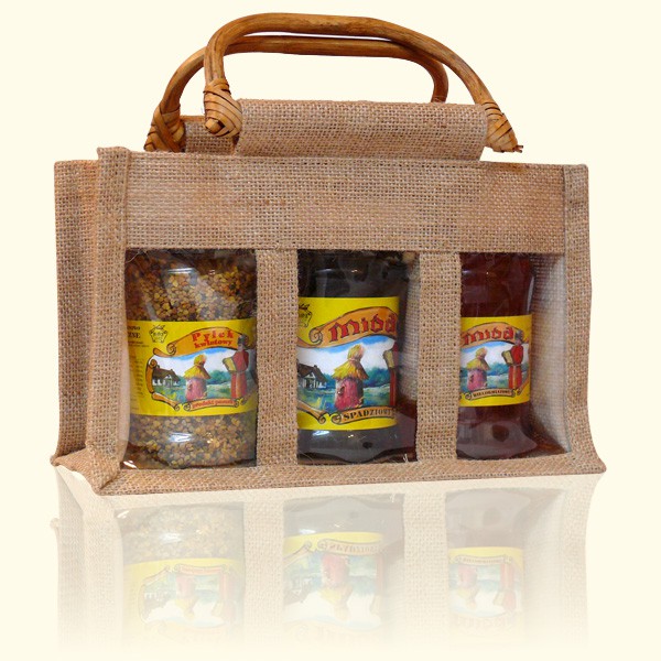 Zestaw trzech produktów pszczelich w gustownym poręcznym koszyczku